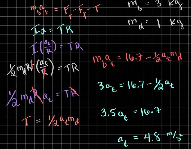 - A block of mass 3 kg slides down an inclined plane at an angle of with a massless tether attached to a pulley with mass 1 kg and radius 0.5 m at the top of the incline (see the following figure). The pulley can be approximated as a disk. The coefficient of kinetic friction on the plane is 0.4. What is the acceleration of the block?