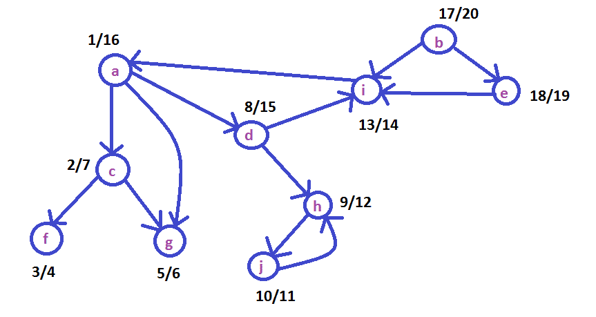 We consider that at the iteration of the algorithm, we look at the nodes alphabetically. Also the nodes are registered alphabetically in each list. I want to calculate the "discovery" time and the "finish" time for each node and also the kind of each edge.
