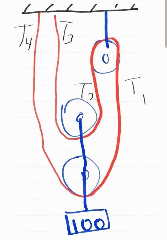Therefore, top right pulley (T1+T2 = 50lbs)? T3=25lbs? T4=25lbs?