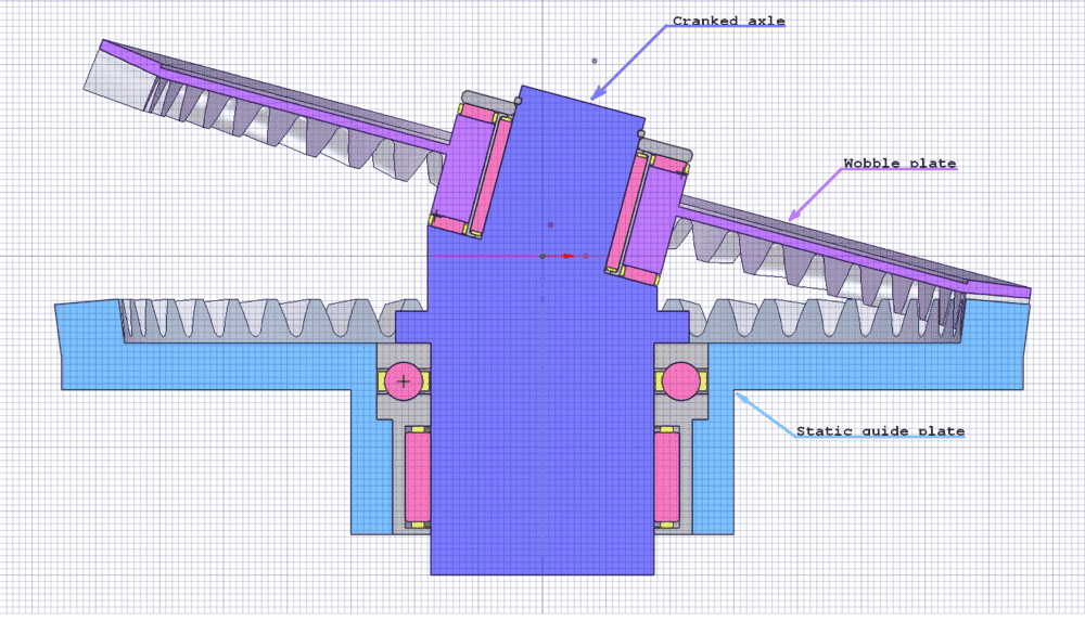 The upper end of the axle is cranked (as shown, to 15deg), and a "wobble plate" (purple) is mounted to that via another combination of thrust and radial bearing such that the cranked axle and wobble plate can freely rotate with respect to each other around the cranked axle axis.