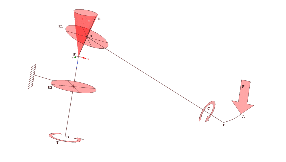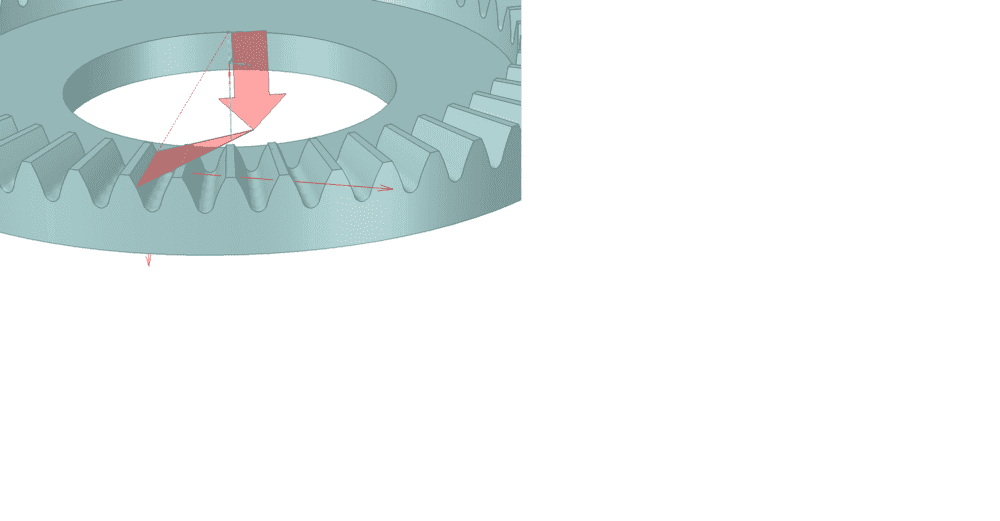 A force F, acting at some distance AB around the periphery of the wobble plate from the pitch point of the currently engaged tooth B, acts as a lever, and creates a torque C, around the radial pitch axis BD.