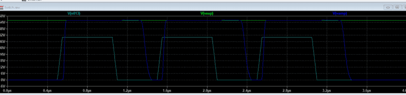 There are some problems with the existing circuit because both MOSFETs are on at the same time during the turn-on transition. It is only for 50 nsec, but the through-current peaks at 16 amps.