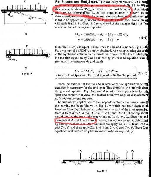 - One participant questions the assertion that the fixed end moment is zero when the far end is pinned or roller supported, suggesting that the fixed end must resist shear force and therefore should have a non-zero angle of rotation.