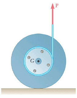 "A drum of 60-mm radius is attached to a disk of 120-mm radius. The disk and drum have a total mass of 6 kg and a combined radius of gyration of 90 mm. A cord is attached as shown and pulled with a force P of magnitude 20 N. The disk rolls without sliding. Determine the minimum value of the coefficient of static friction compatible with this motion."