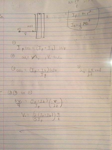 The discussion focuses on a physics problem involving the conservation of angular momentum during a collision between a particle and a uniform rod. The rod, with length L and mass M, is struck by a particle of mass m at a distance of 0.8L from the pivot. The particle's velocity v is to be determined, given that the rod reaches a maximum angle of 90 degrees post-collision. Key equations related to moment of inertia and angular motion are referenced, with the user indicating a need for additional equations to finalize the solution.