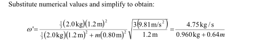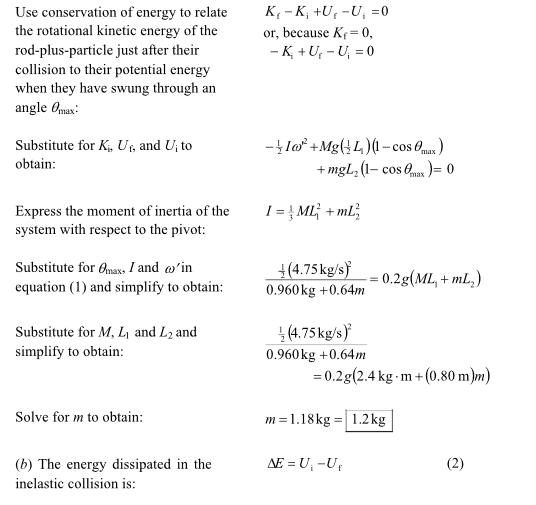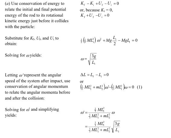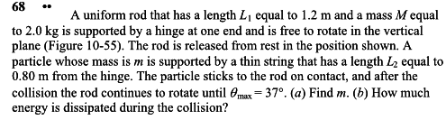 A uniform rod of length L1 = 1.5 m and mass M = 2.8 kg is supported by a hinge at one end and is free to rotate in the vertical plane. The rod is released from rest in the position shown. A particle of mass m is supported by a thin string of length L2 = 1.1 m from the hinge. The particle sticks to the rod on contact. After the collision, θmax= 45°.