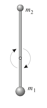 - A rigid uniform rod of negligible mass is able to rotate around a pivot. Two masses, ##m_1=250g## and ##m_2=200g##, are placed at the ends at distances ##d_1=100cm## and ##d_2=150cm## from the axis of rotation. The system, originally stable in its vertical position, gets moved slightly in the clockwise direction, putting it into rotation. Friction is negligible.