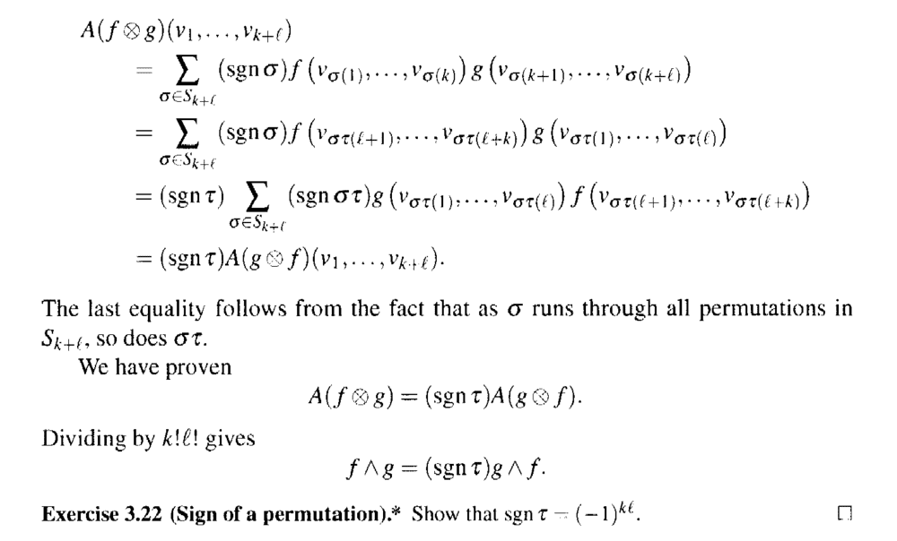 ... ##= \sum_{ \sigma_{ k + l } } ( \text{ sgn } \sigma ) f( v_{ \sigma \tau (l+1) }, \cdot \cdot \cdot , v_{ \sigma \tau (l+k) }) g ( v_{ \sigma \tau (1) }, \cdot \cdot \cdot , v_{ \sigma \tau (l) })####= ( \text{ sgn } \tau ) \sum_{ \sigma_{ k + l } } ( \text{ sgn } \sigma \tau ) g ( v_{ \sigma \tau (1) }, \cdot \cdot \cdot , v_{ \sigma \tau (l) }) f( v_{ \sigma \tau (l+1) }, \cdot \cdot \cdot , v_{ \sigma \tau (l+k) })##
