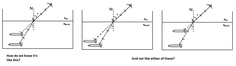 Participants highlight the need for careful consideration of angles and ray diagrams, indicating that the discussion may depend on specific definitions and assumptions related to refraction and observation angles.