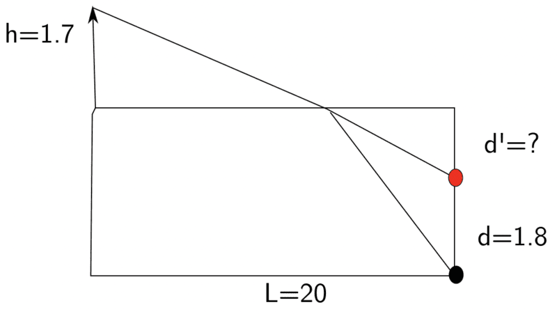 - A person (the arrow at the upper left of the figure) of height ##h=1.7m## is standing at the edge of a pool of water of depth ##d=1.8m## in which there is an object located at the farthest end of the pool (black ball in the figure). What is the apparent depth of this object for the person looking at the pool, i.e. what is the depth of the object observed by the person (red ball in the figure)?