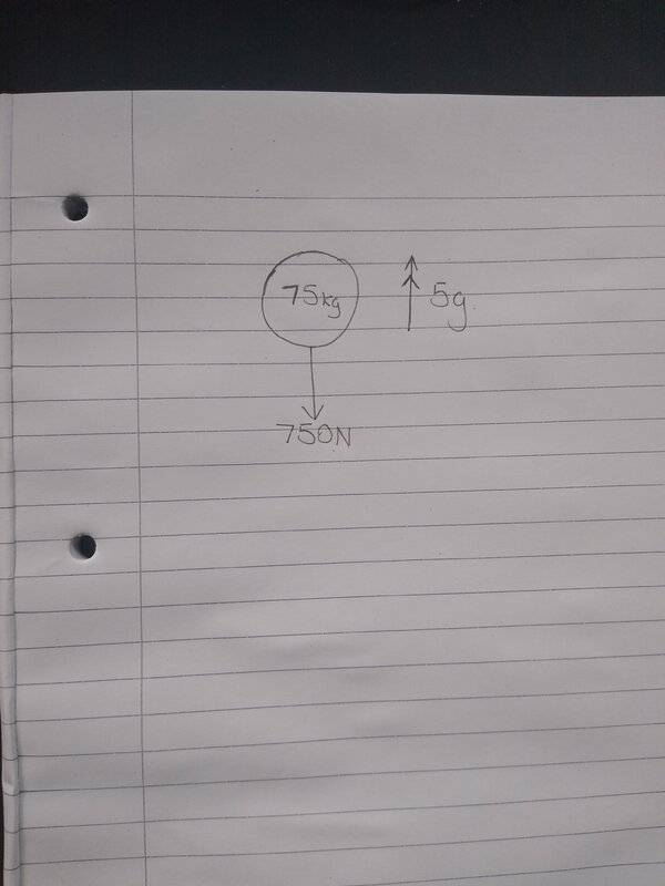 I initially attempted to get the answer by multiplying the mass by 50, as I assumed if the upward acceleration was 5g then the weight could be found by just multiplying the mass by the acceleration of 50ms^-2. However that resulted in an answer of 3750 which was far below the correct answer of 4500. After much trial and error I only got the correct answer when I multiplied the mass of 75kg by an acceleration of 60ms^-2, however I do not understand why this works.