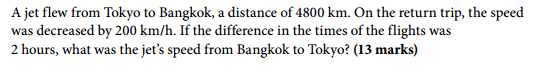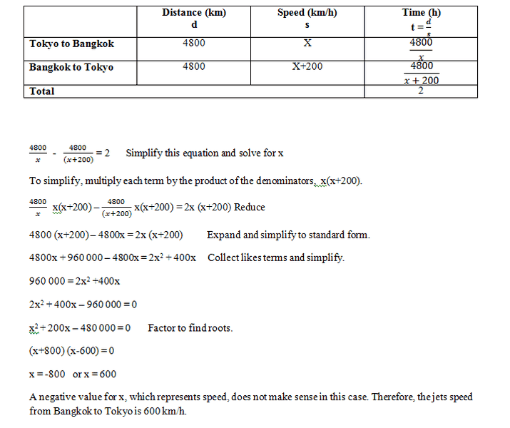 There's still a problem, x is the Tokyo to Bangkok speed. That can't be 600mph. 600 - 200 is 400, and that doesn't work out.Evangeline101 said:I understand where I made the error, the return trip speed decreased by 200 km/h, so it should have been (x-200) not (x+200), so I have corrected my answer:[ ATTACH=full]101104[/ATTACH]