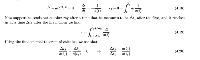 Let me call ## \int dt \frac{1}{a(t)} = b(t) ##, 4.18 says that ##b(t_2)-b(t_1)=r_1 ## whilst 4.20 is looking at something completely different : ## b(t_2 + \Delta t_2)-b(t_1+\Delta t_1) ##(and so rather than an application of the FoC I thought it was expansion of ##b(t)## assuming ##\Delta t_2 ## is small)