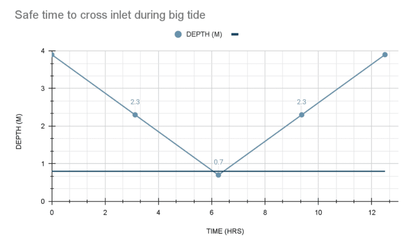 Find a safe time to cross the inlet during this big tide and discuss DOC’s recommendation in relation to your findings for both tidal situations.