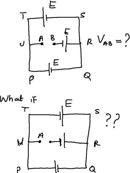 Find the Voltage across A B in the following circuit. Each cells has negligible internal resistance and an EMF of E volts.