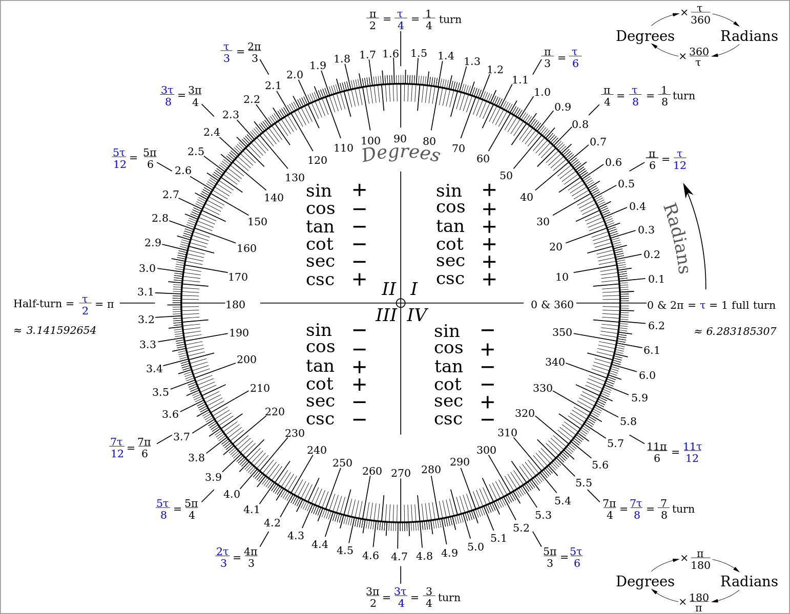 Note: The degrees on the unit circle are in increments of 10 degrees.