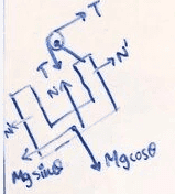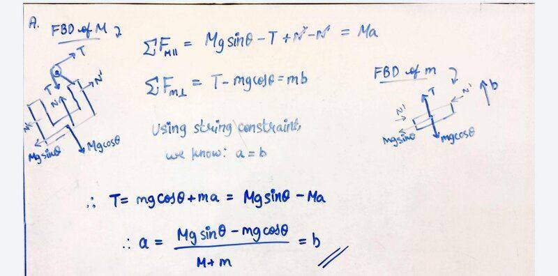 The discussion revolves around a pulley and wedge system involving two masses, M and m, and the effects of an incline on their acceleration. Participants are examining the implications of normal forces and the setup of the problem, particularly when the incline angle is zero.