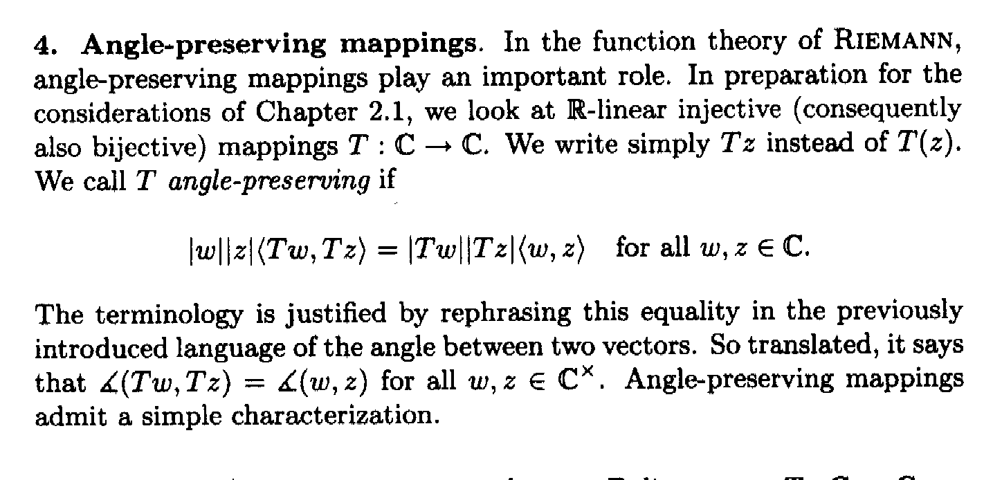 I am focused on Chapter 0: Complex Numbers and Continuous Functions ... and in particular on Section 1.4: Angle-Preserving Mappings ... ...