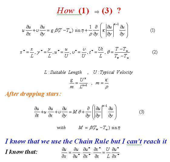 u^*\frac{\partial u^*}{\partial x^*}+ v^*\frac{\partial u^*}{\partial y^*}= m\cdot \frac{U^{n-1}}{L^n}\cdot \left[M\cdot \theta + \frac{\partial}{\partial y^*} \left[\left|\frac{\partial u^*}{\partial y^*}\right| ^{n-1} \right]\cdot \frac{\partial u^*}{\partial y^*}\right]