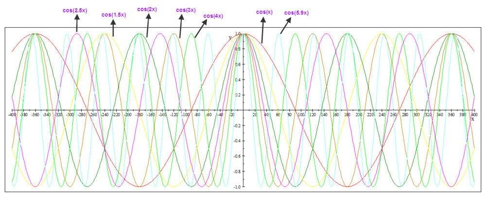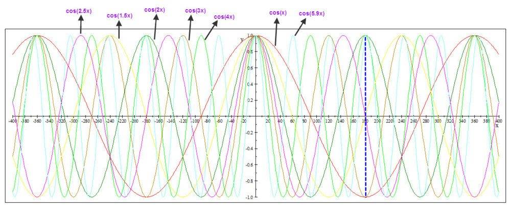 - This question just came to my mind and I thought I should confirm it. Are the cosine functions with the same amplitude but different frequencies are totally in phase at any other point other than the origin? The frequency, f, could be 0<f<∞. I'm not sure if the answer is obvious.