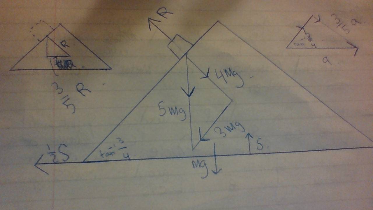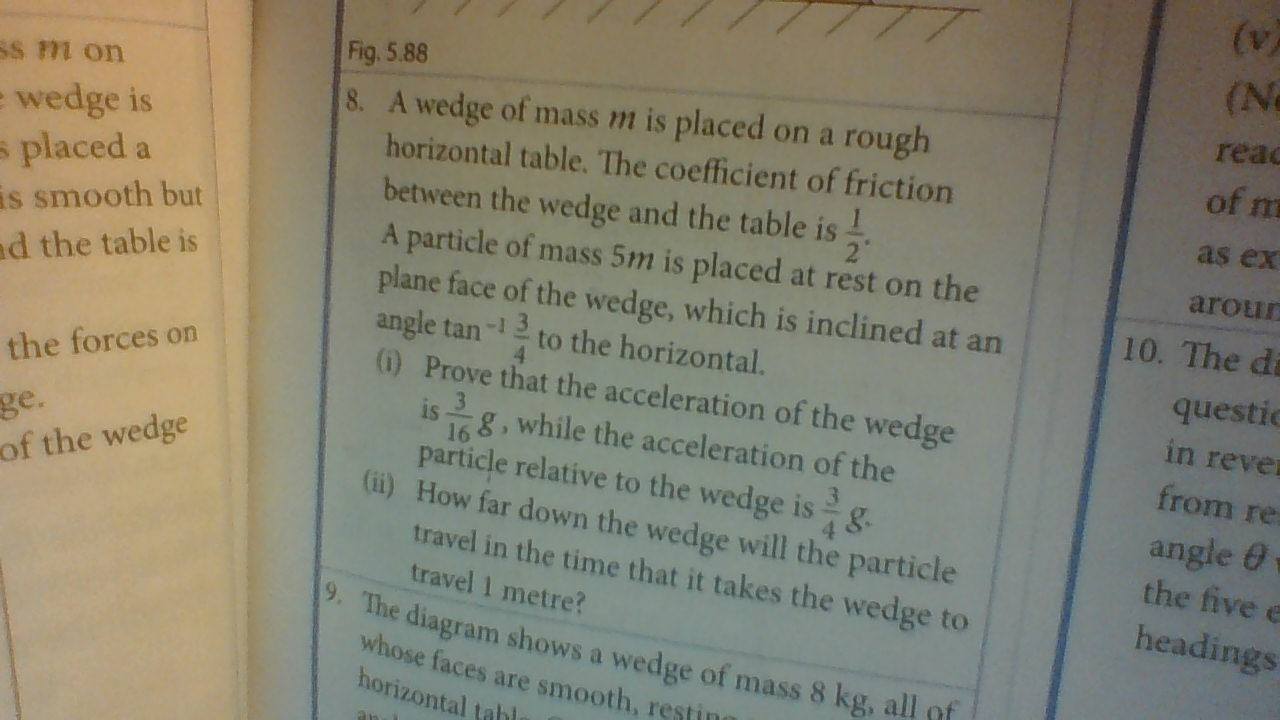 im stuck on question 8. the equation i got for the wedge is .6R -.5S=ma r stands for relative force of the particle s stands for relative force of the wedge . i got the equation 4mg-R=5m(.6a) for the particle where a stands for acceleration of the wedge. does anyone know where to go from here. are my equations wrong? i can post a picture of my diagram if anyone needs it