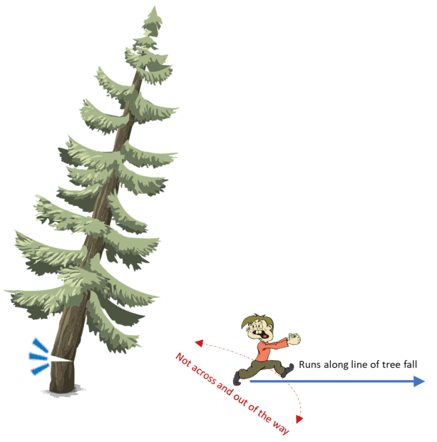 - In movies, when something tall falls toward the protagonist, they run along the line of the fall. Why?