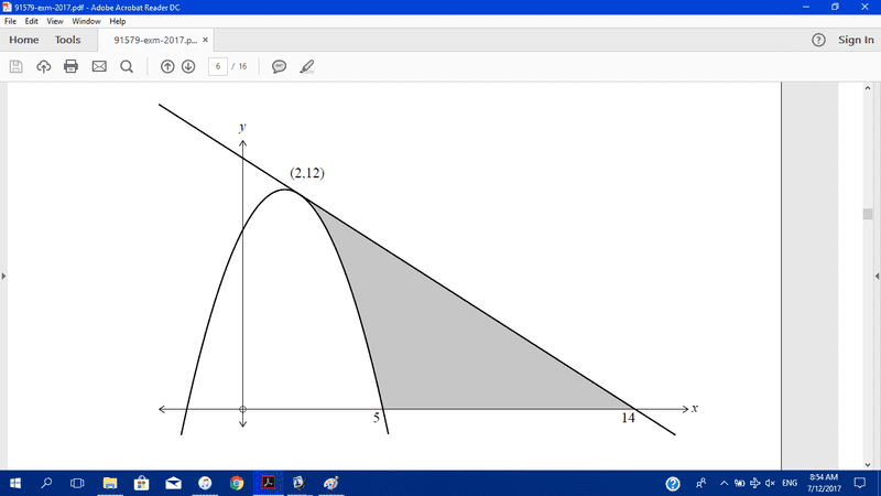 - Some participants question the choice of integration bounds, particularly the origin of the values ##5## and ##14##. Others express concerns about the problem being underspecified and the potential for infinite area without clear bounds. There are discussions about the necessity of justifying the removal of absolute value signs in the integral setup.