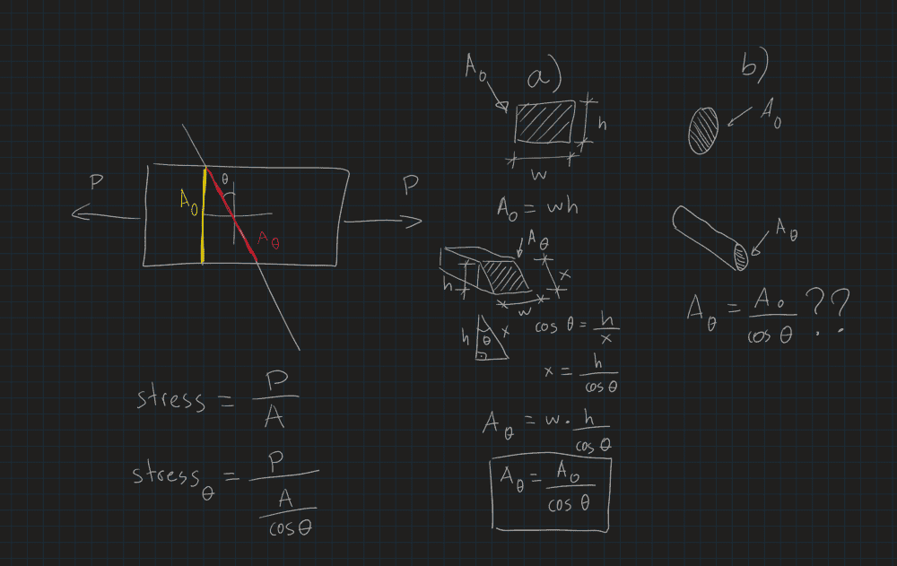Hi, I have a problem with inclined planes. The idea is to calculate the stress in an inclined plane of a bar under tension for which you need the surface. I have no idea how this surface is derived, though. In the attached file, you can see what I mean. For a rectangular cross-section, it's straightforward, just applying the rectangle area with the new inclined length. Now, everywhere I see, everyone uses the same rectangular bar as an example.