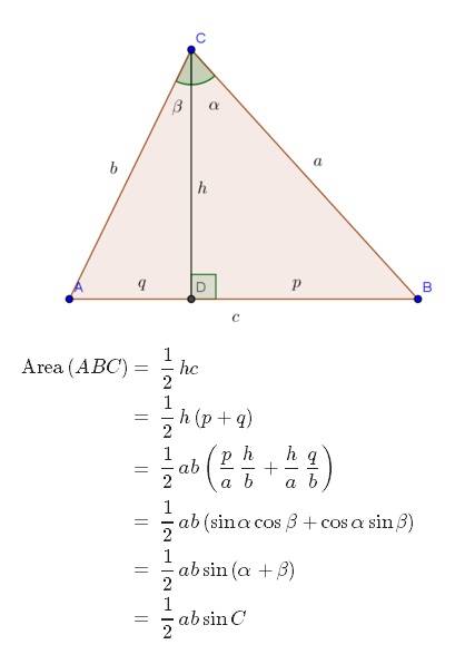 The discussion focuses on the proof of the area of an isosceles triangle, specifically the derivation of the third line in the proof. The key steps involve multiplying the expression $h(p + q)$ by $ab/ab$ to maintain equality, leading to the formulation of the area as $\frac{1}{2}h(p + q) = \frac{1}{2}ab\left(\frac{p}{a}\frac{h}{b} + \frac{h}{a}\frac{q}{b}\right)$. This manipulation clarifies how the area is expressed in terms of the triangle's height and base lengths.