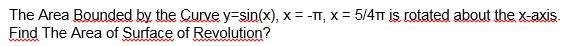 The surface area of revolution for the function \( f(x) = \sin{x} \) over the interval \([-π, \frac{5π}{4}]\) is calculated using the formula \( S = 2\pi \int_a^b f(x) \sqrt{1+[f(x)]^2} \, dx \). The integration is split into two parts: \( S = 4\pi \int_0^\pi \sin{x} \sqrt{1+\cos^2{x}} \, dx + 2\pi \int_0^{\pi/4} \sin{x} \sqrt{1+\cos^2{x}} \, dx \). By substituting \( u = \cos{x} \) and \( u = \tan{t} \), the integrals simplify to \( S = 8\pi \int_0^{\pi/4} \sec^3{t} \, dt + 2\pi \int_{\arctan(1/\sqrt{2})}^{\pi/4} \sec^3{t} \, dt \). The final result approximates to \( S \approx 31.27 \).