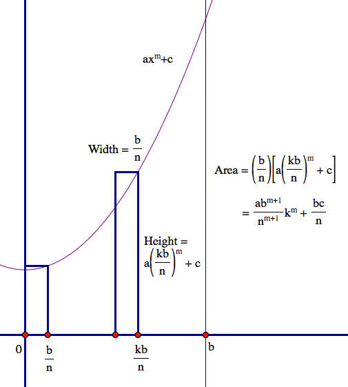 The discussion revolves around calculating the integral $$\int_0^b (ax^m+c)\,dx$$ using Archimedes' method of exhaustion. Participants are exploring the application of this historical method to a specific problem from Tom Apostol's calculus book, focusing on the mechanics of summation and inequalities involved in approximating the area under a curve.