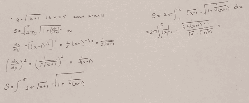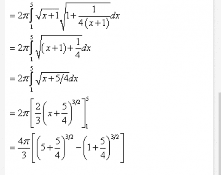 The discussion revolves around finding the area of the surface generated by revolving the curve y=√(x+1) from x=1 to x=5 about the x-axis. Participants are exploring the mathematical reasoning and algebraic manipulations involved in applying the surface area formula.