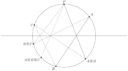 Now, define an operation $$\boxplus$$ over the points of the 2-sphere $$\Gamma$$ by constructing $$A \boxplus B$$ by joining them and finding the intersection of $$AB$$ with the equatorial plane of $$\Gamma$$; call it $$C$$ and construct $$\zeta^{-1}(C)$$ to map it on $$\Gamma$$ again through usual methods.