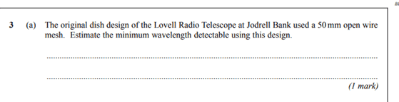The discussion revolves around the calculation of the antenna size for a wire mesh radio telescope, specifically questioning how a 1-meter measurement was derived. The mark scheme indicates that 50mm relates to the resolving power, adhering to the Rayleigh criterion. Participants seek clarification on the application of the Rayleigh criterion equation in this context, particularly in relation to the provided problem statements and mark schemes from the January 2003 astrophysics exam papers.