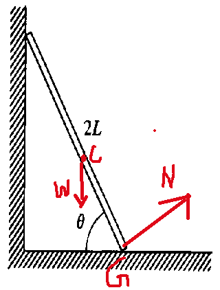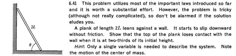The discussion revolves around the dynamics of a plank leaving a wall at an angle, focusing on torque, forces, and the motion of the center of mass. Participants are analyzing the conditions under which the plank detaches and the implications of angular acceleration in the context of rotational motion.