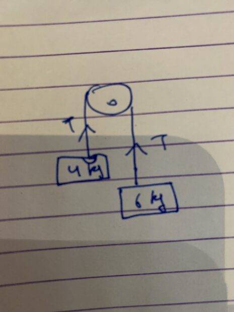 I want to ask in this machine when there are two masses hanging down then the tension T is directed upwards along the rope. Is it the force applied by the rope on the mass? Is it the force applied by the pulley? When the anyone mass of the machine moves downwards is it because the force of gravity >tension T ?
