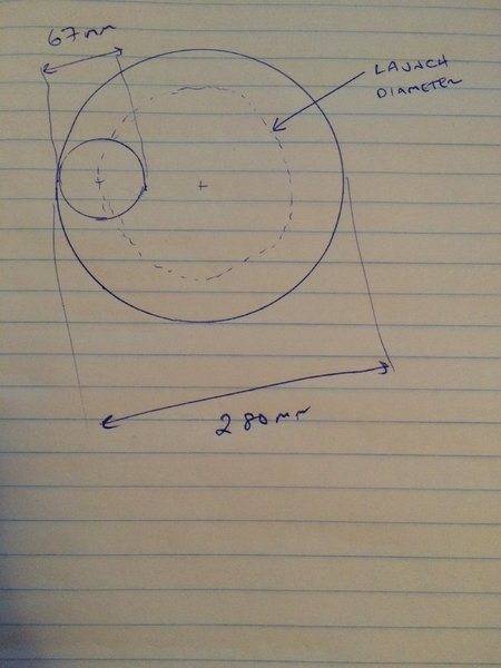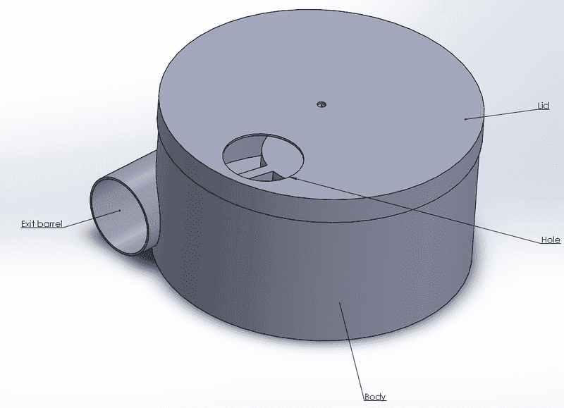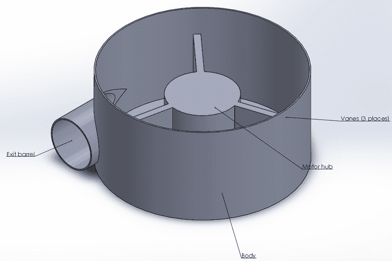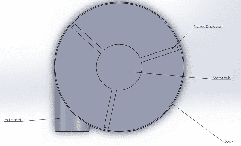 Bucket outside diameter is approximately 280mm. The basic idea is that sensors detect when the ball has been loaded. A positive ball detection triggers the motor (not shown, it will be situated underneath the unit) to rotate the hub and vanes within the bucket. The vanes rotating will launch the ball out of the barrel. Solar panels (not shown) likely mounted somewhere on the lid will charge a battery bank (not shown) situated underneath the unit next to the motor.