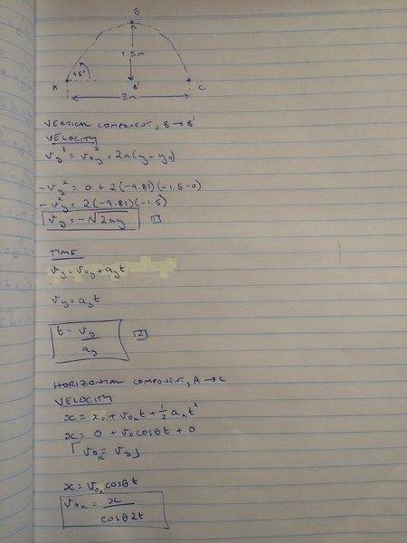 - determine exit velocity required to launch ball three metres at an angle of thirty degrees.