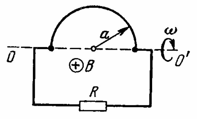 A wire shaped as a semi-circle of radius a rotates about the axis OO’ with a constant angular velocity ω in a uniform magnetic field with induction B (attached figure). The plane of the rectangular loop is perpendicular to the magnetic field direction. The total resistance of the circuit is R. Neglecting effects of the magnetic field that is generated by the current in the circuit, find the mean thermal power dissipated during one rotation period.