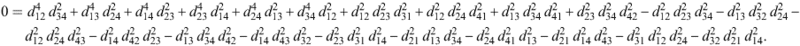&&-d_{23}^{2}d_{31}^{2}d_{14}^{2}-d_{21}^{2}d_{13}^{2}d_{34}^{2}-d_{24}^{2}d_{41}^{2}d_{13}^{2}-d_{21}^{2}d_{14}^{2}d_{43}^{2}-d_{31}^{2}d_{12}^{2}d_{24}^{2}-d_{32}^{2}d_{21}^{2}d_{14}^{2}