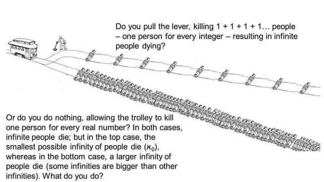 The main flaw I mean to point out is that there will never exist a time when the number of people the train has run over is non-finite (at least in the first case for sure).