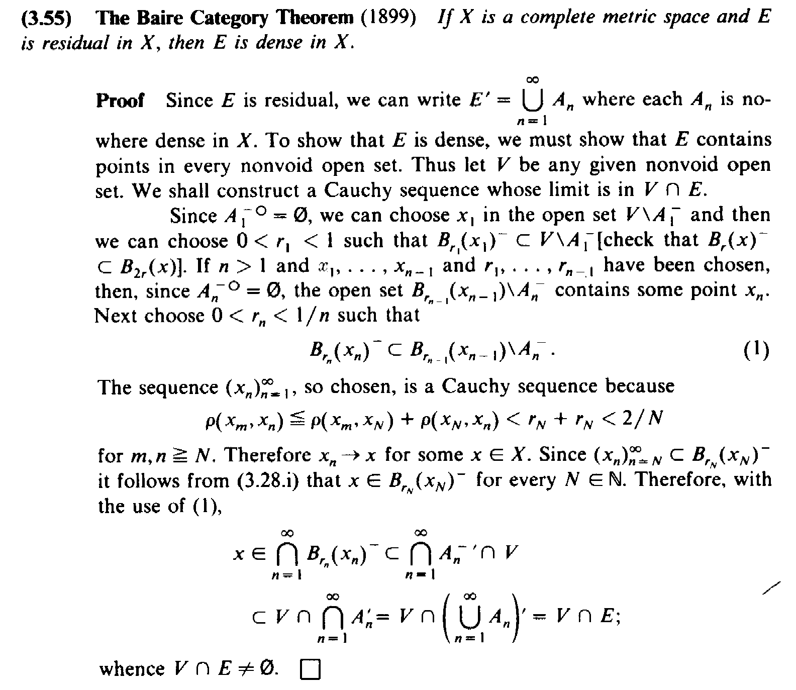 " ... ...Since $$A_1^{ - \ \circ } = \emptyset$$, we can choose $$x_1$$ in the open set $$V$$ \ $$A_1^{ - }$$ and then we can choose $$0 \lt r_1 \lt 1$$ such that $$B_{ r_1 } ( x_1 )^{ - } \subset V$$ \ $$A_1^{ - }$$ [ check that $$B_r (x)^{ - } \subset B_{ 2r } (x) $$ ] ... ...My questions are as follows:Question 1