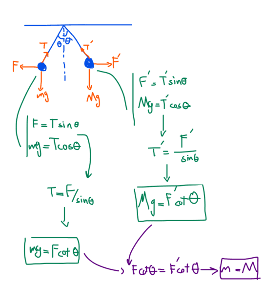 - I know that in order for the ropes to have an equal angle as shown in the figure below, the weight of the two balls and the sign of the electric charge must be the same.