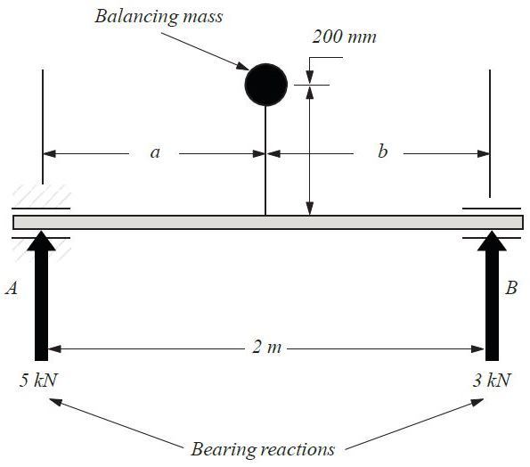 A shaft 2m long rotates at 1500 revs min-1 between bearings as shown. The bearings forces of 5kN and 3kN acting in the same plane as shown. A single mass is to be used to balance the shaft, so that the reactions are zero. The mass is to be placed at a radius of 200mm from the shaft centre, 180o from the direction of the bearing reactions. Determine the size and position (a and b) of the mass to be used.