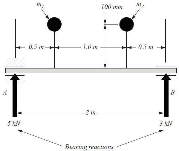 The shaft in part A is to be balanced using two mases (m1 and m2) placed 0.5m and 1.5m from end A and 180o from the direction of the bearing reactions, each on radius arms 100mm long. Calculate the sizes of m1 and m2.