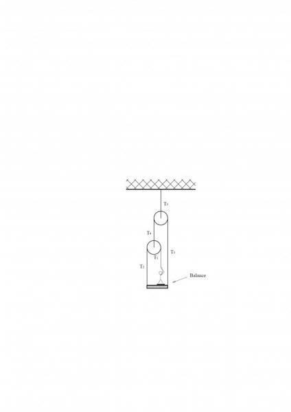 The discussion revolves around a scenario involving a man standing on a scale while pulling on a rope connected to two pulleys. The problem includes considerations of forces, tensions, and the weight displayed on the scale, with specific values provided for the man's mass and tensions in the system.