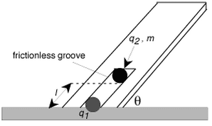 A single charge q1 = 1.10E-7 C is fixed at the base of a plane that makes an angle theta with the horizontal direction. A small ball of mass m = 1.75 g and a charge q2 = 3.30E-8 C is placed into a smooth frictionless groove in the plane that extends directly to the fixed charge (image attached.) It is allowed to move up and down until it finds a stable position d = 11.0 cm from the fixed charge. What is the value of theta (t)?