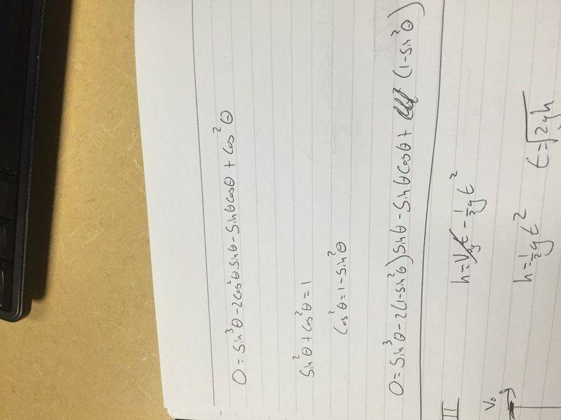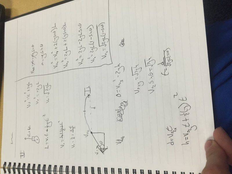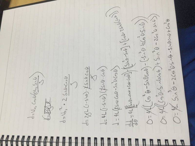 My attempt is a bit messy, as you can see below, but I tried to find an equation to describe the initial velocity at the base of the ramp, and an equation to describe the velocity as it leaves the ramp. Then I plugged that into basic projectile motion equations, and got d in terms of constants and θ. I then took the deriviative to find the optimal angle, but I could not figure out the equation. The homework is due Friday (9/18/2015) at 5pm, and I have not been able to figure it out.
