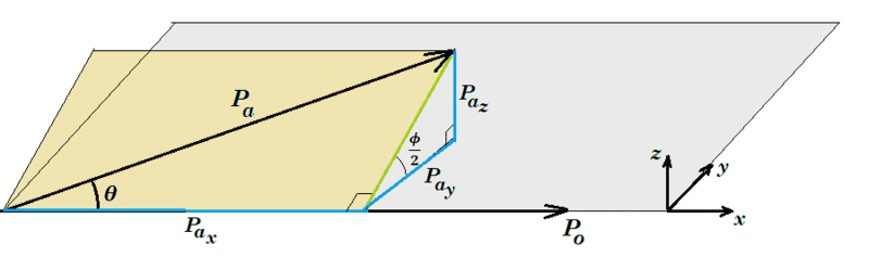 $$p_e^2 \equiv \textbf{p}_e\cdot \textbf{p}_e = p_a^2+p_b^2+p_o^2 + 2\textbf{p}_a\cdot \textbf{p}_b - 2\textbf{p}_a\cdot \textbf{p}_0 - 2\textbf{p}_0\cdot \textbf{p}_b $$ $$= p_a^2+p_b^2+p_o^2 + 2p_ap_b\cos(\pi - \phi) - 2p_ap_0\cos \theta - 2p_bp_0\cos \theta$$