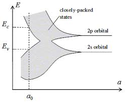 For another example: It's clear from the diagram, that the 2S band gets taller vs. 'a' spacing, until a spot near a0, but then starts shrinking again. But I have no idea why, or what form of equation would qualitatively describe the S band's difference in height at any give atomic spacing 'a', it's center, or the absolute position of it's top or bottom.